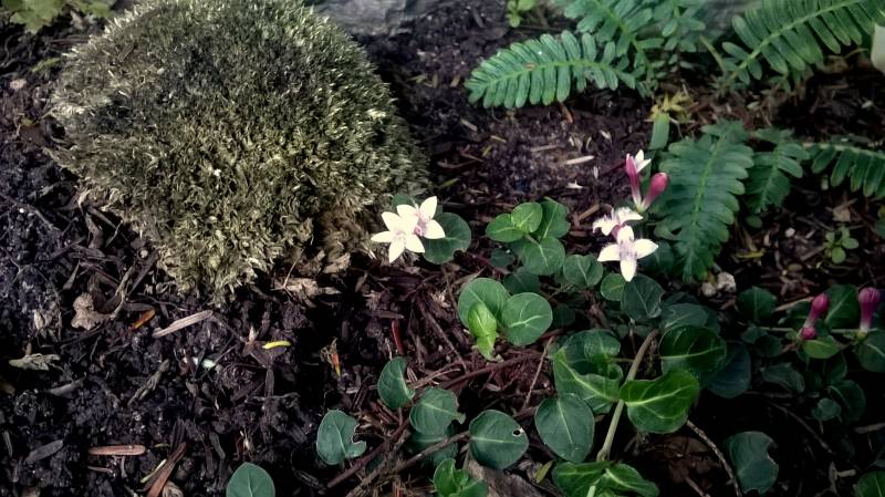 Mitchella bez przykrycia. W pierwszych dwóch latach podczas największych mrozów narzucałam czasem jakąś gałąź, ale teraz, gdy kłącza weszły pod kamienie i korzenie, nie zabezpieczam ich.