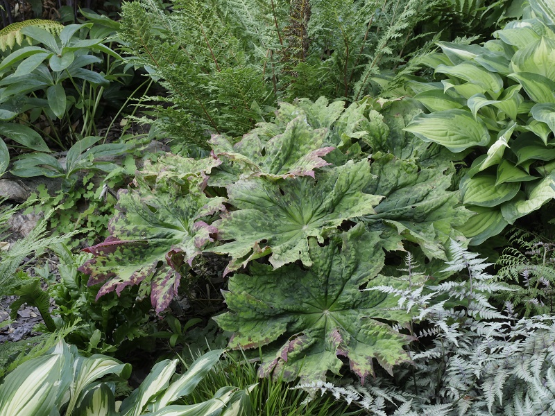 Podophyllum hemsleyi bardzo szybko startuje wiosną i co rok, pierwsze parasolki przemarzają. Dostał więc bardziej cieniste stanowisko niedaleko sosny.