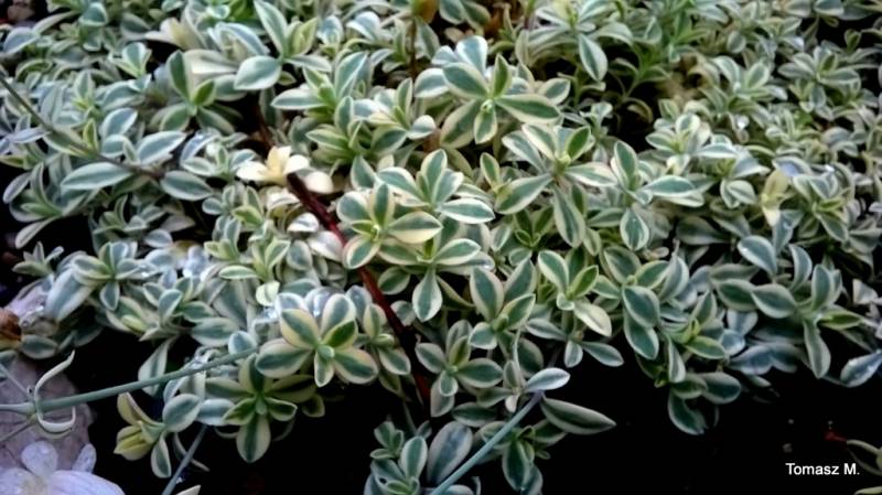 Ma pokładające się, dość cienkie pędy, pokryte sino-zielonymi liśćmi.