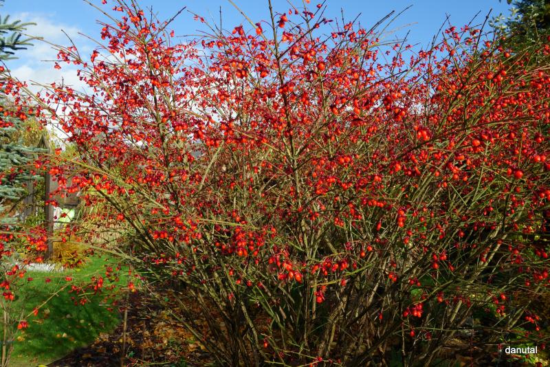 Na zimę liście opadają, a ozdobnie prezentują się brązowe pędy ubrane w korkowe skrzydełka.