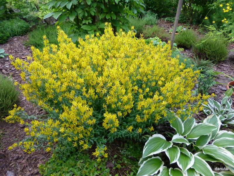 Pochodzący z Bałkanów niski (do 0,5m wys.) ścielący się krzew o niebiesko-zielonych, wiotkich pędach. Kwiaty motylkowe, złocisto-żółte, bardzo gęsto pokrywające całą roślinę końcem maja.
