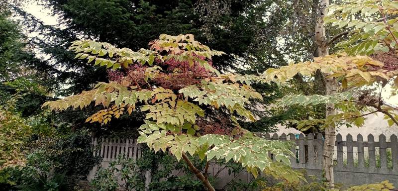 Aralia elata 'Aureovariegata' ładnie otrząsnęła się po wiosennych przemrożeniach:
