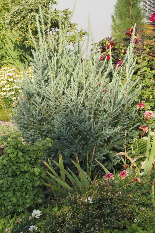 Stożkowy, wąski. Dorasta do 20 m wysokości. Rośnie dość powoli. Korona wąska, gałęzie krótkie, nieco zadarte do góry.