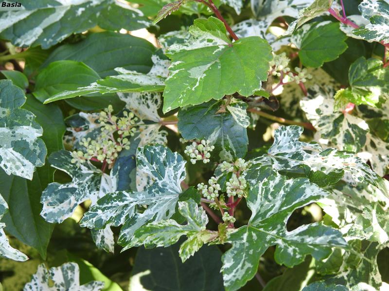 Liście: trójpalczaste, pokryte zielono-różowo-białym marmurkiem