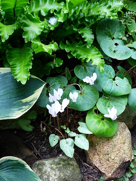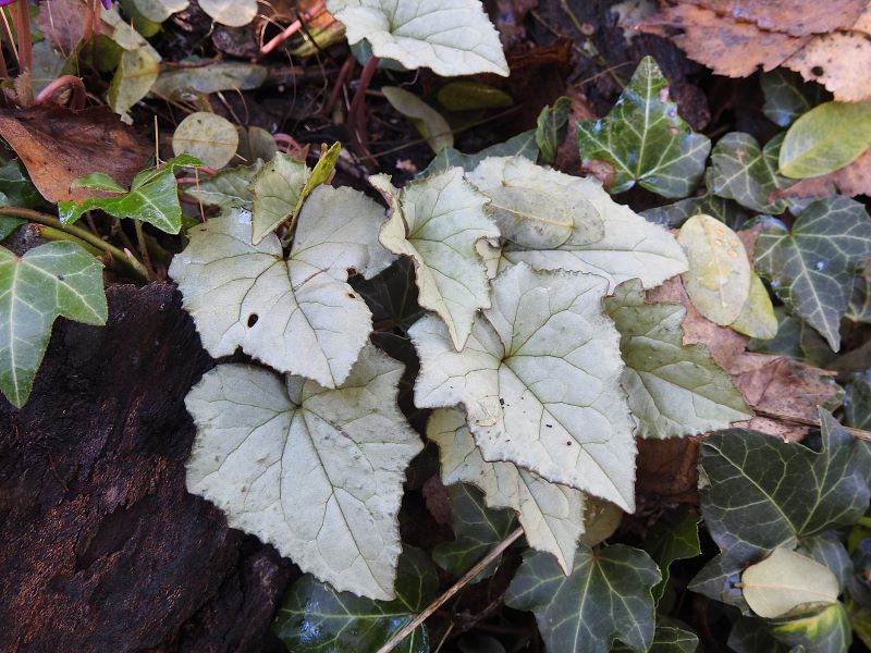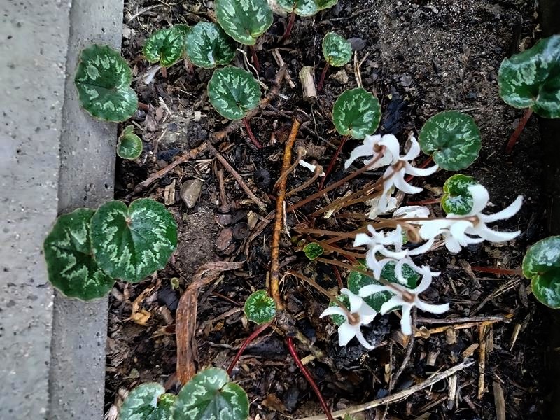 Cyclamen hederifolium 'Silver Leaf Alba' kwitnie dużo, dużo skromniej i dopiero niedawno zaczął produkować liście