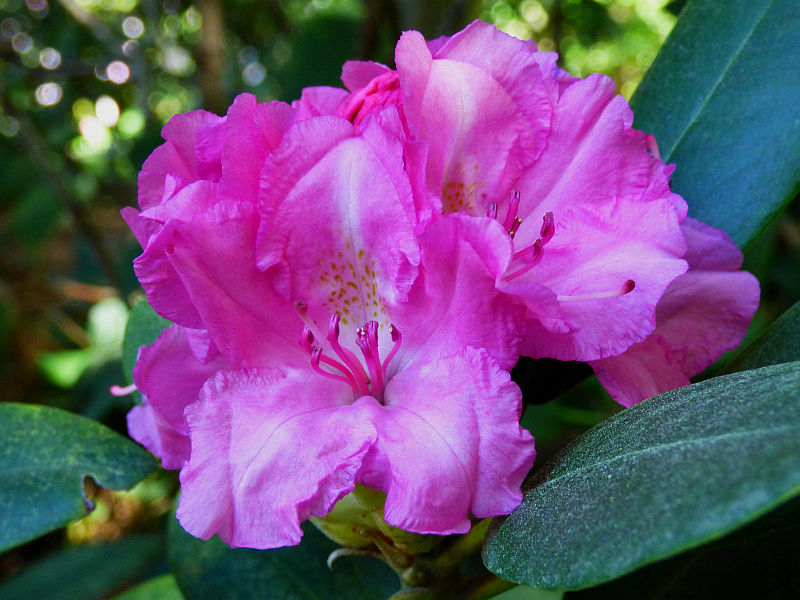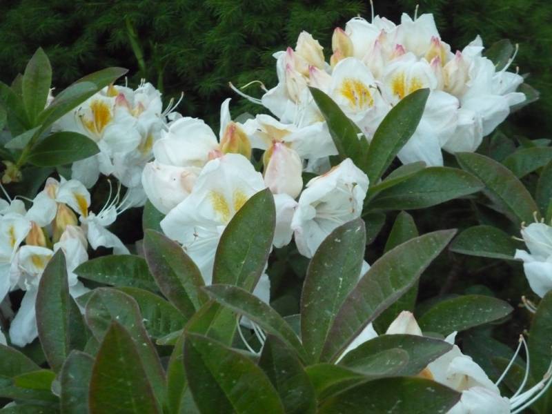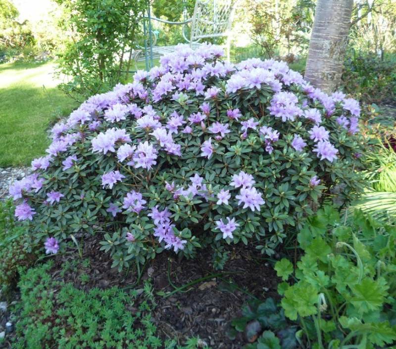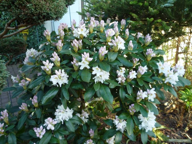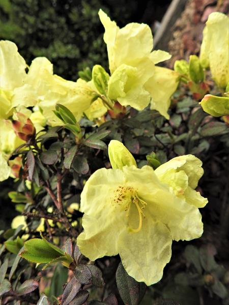 Rhododendron ludlowii albo któraś z jego odmian 'Wren' albo 'Curlew'... 'Wren dorasta po 10 latach do hen... 20 cm przy 40 cm szerokości...