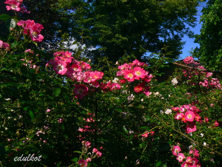 Kwiaty różowe z białym środkiem, średnie, pojedyncze do półpełnych w dużych gronach, kwitnie raz.