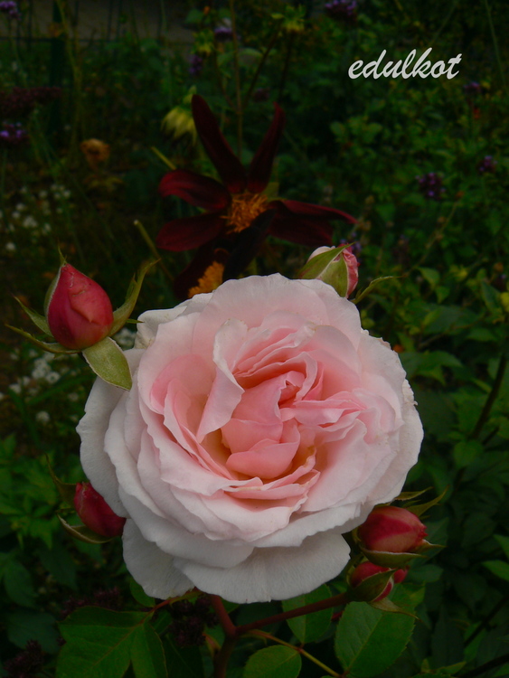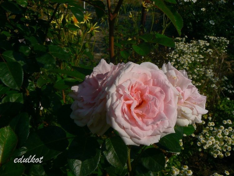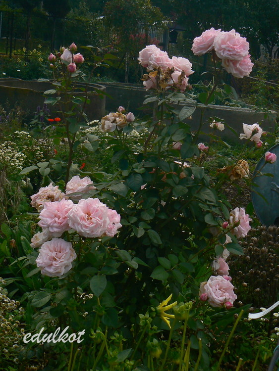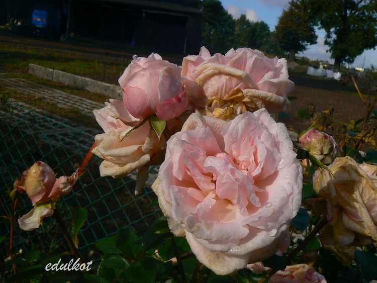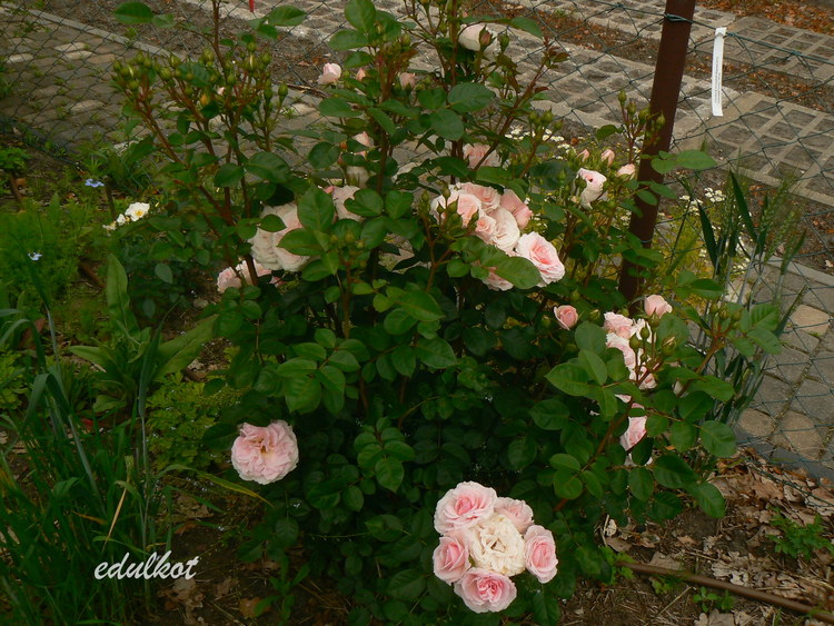 Kwiaty: duże, pełne, różowe, starzejące się do kremowego, powtarza kwitnienie,
