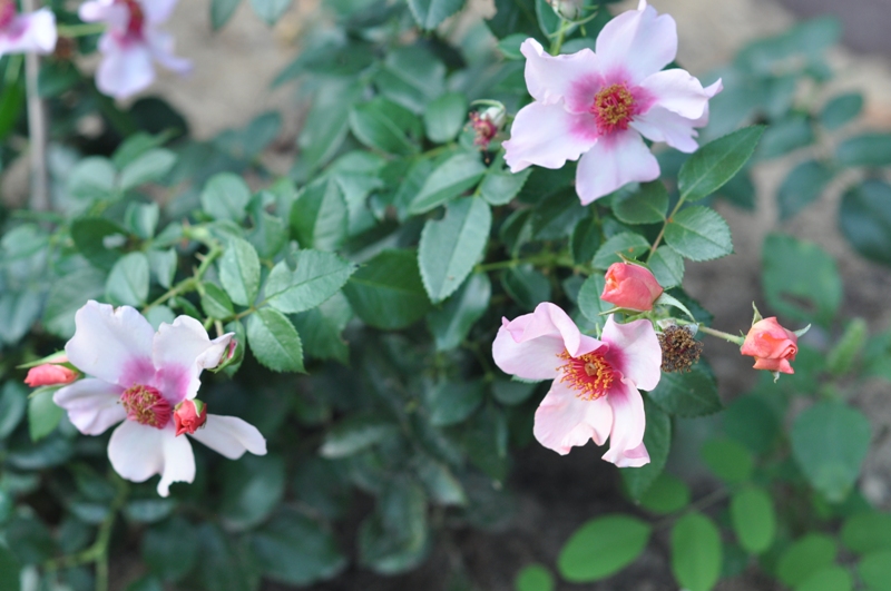 Kwiaty: łososiowo różowe z malinowym oczkiem, pojedyncze (4-8 pofalowanych płatków), Ø 4-6 cm, zebrane po 5-7 sztuk w duże grona