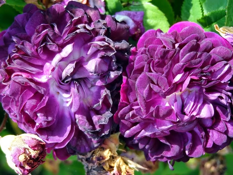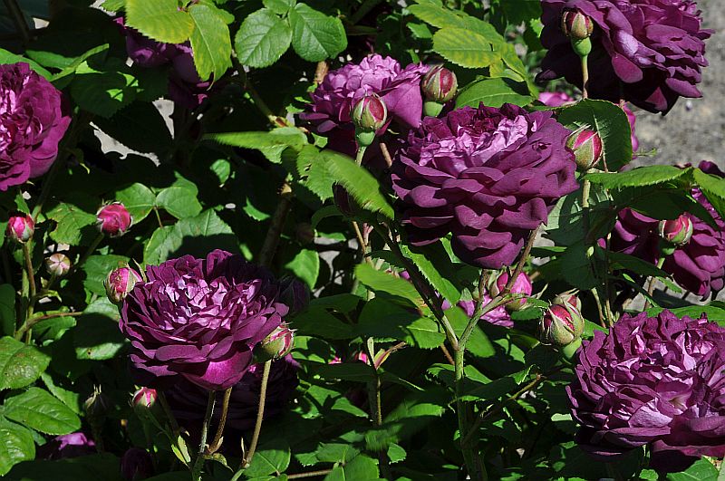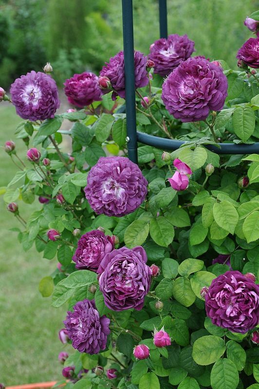 Kwiaty o intensywnym kolorze purpury z białym okiem. Nie pachną. Kwitną raz na zeszłorocznych pędach dlatego przycinać należy po kwitnieniu, jak każdą różę raz kwitnącą.