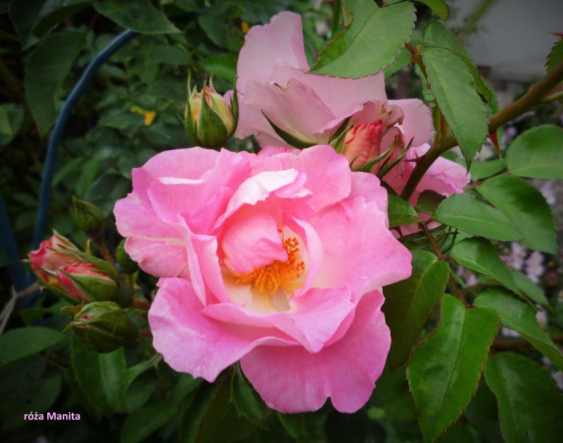 Kwiaty półpełne o różowym kolorze z żółtymi pręcikami, 8-9 cm.