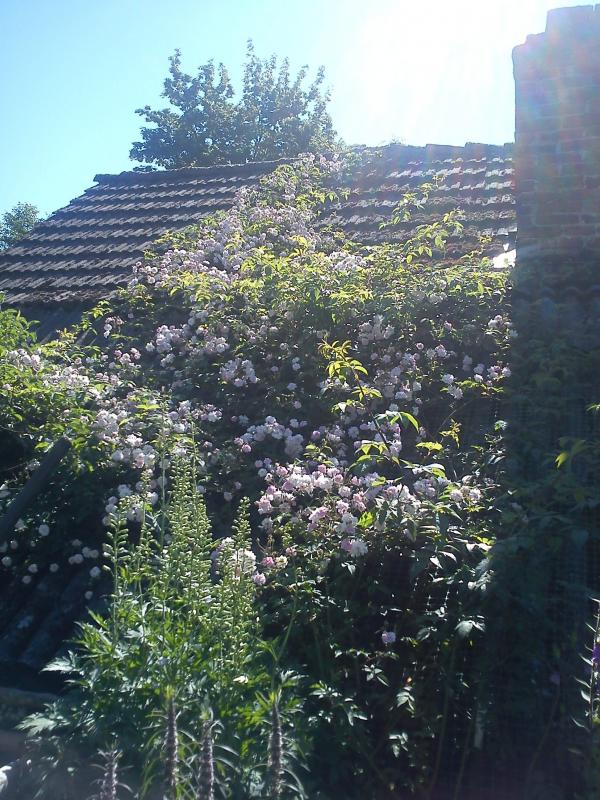 Pnąca, rambler. Raczej do prowadzenia przy drzewach, ponieważ wzrost ma niepohamowany, pędy cienkie, długie, wiotkie i kolczaste do przesady. Pięciometrowy roczny przyrost dla tej róży to bułka z masłem. Nie wyobrażam sobie upinania jej na podporze, chyba pod warunkiem, żeby wyznaczyć jej osobistego ogrodnika, dla którego byłaby jedynym obowiązkiem. Teoretycznie, kwitnie na dwuletnich pędach, w praktyce natomiast jest tak zaabsorbowana nieustającym wzrostem, że często zapomina o meritum. Jeśli już jej się zdarzy, wygląda zjawiskowo z pękami różowo- białych pełnych kwiatków, nawet jeśli "strong, musk fragrance" podawany przez Help Me Find okazuje się tylko takim sobie zapachem, wyczuwalnym zresztą dopiero po wetknięciu nosa między płatki...