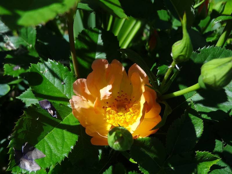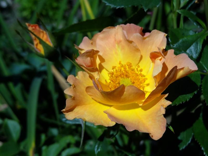 Kwiaty ok. 8 cm, pojedyncze żółto-pomarańczowe, z czasem bledną, z widocznymi złotymi pręcikami. Pachnie. Kwitnie cały sezon bezustannie.