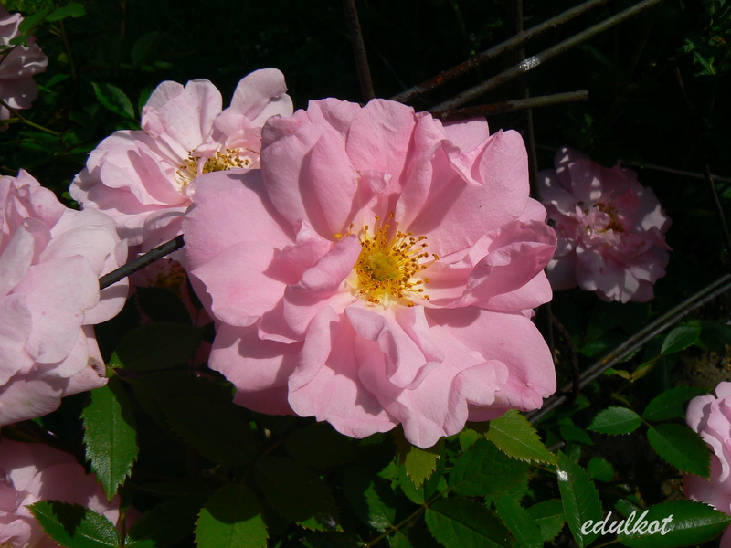 Kwiaty duże, półpełne do pełnych, różowe. Literatura wspomina o niezbyt doskonałym kształcie kwiatów, czego nie potwierdzam. Niestety, nie mogę również potwierdzić informacji o korzennym zapachu, enigmatycznie stwierdzę tylko, że róża wygląda, jakby pachniała