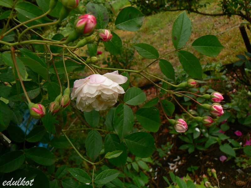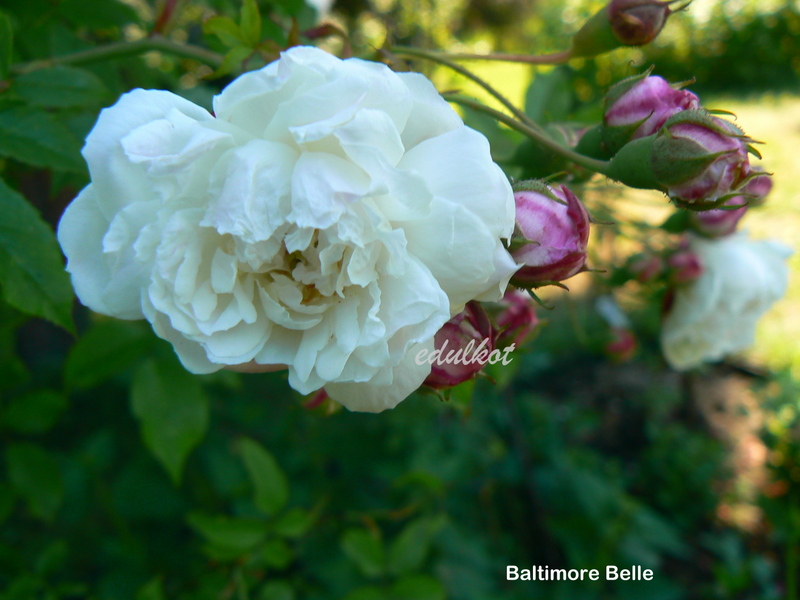 Kwiaty: białe z odrobiną różu, małe o średnicy ok. 6 cm, podwójne (40 płatków), rozwijają się z czerwonych pączków, z tendencją do przewieszania, w niewielkich wiechach, w rozkwicie do płaskiej formy ukazują środek, kwitnie wczesnym latem.