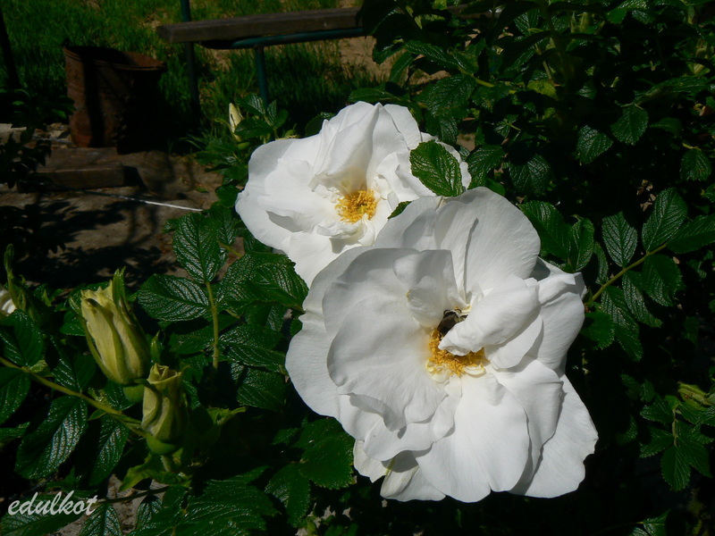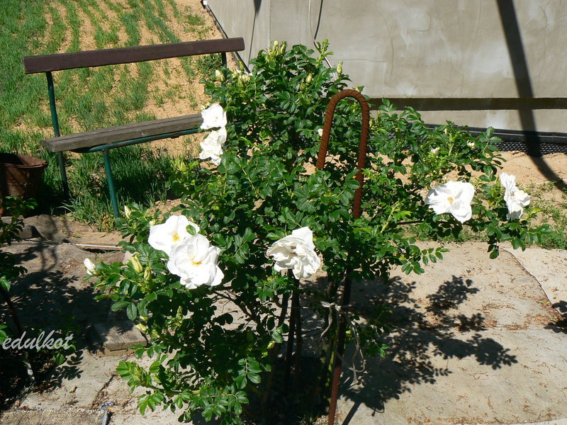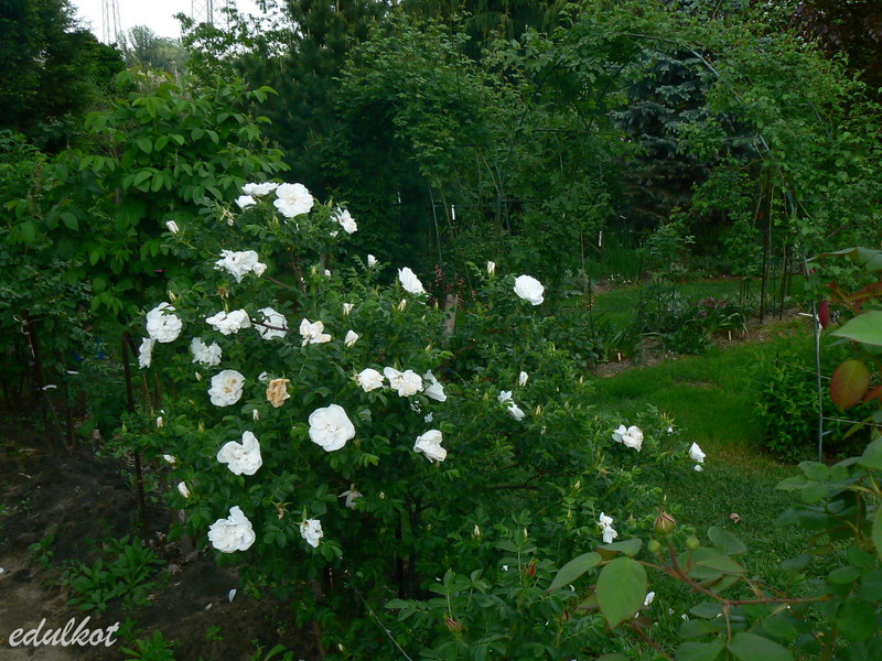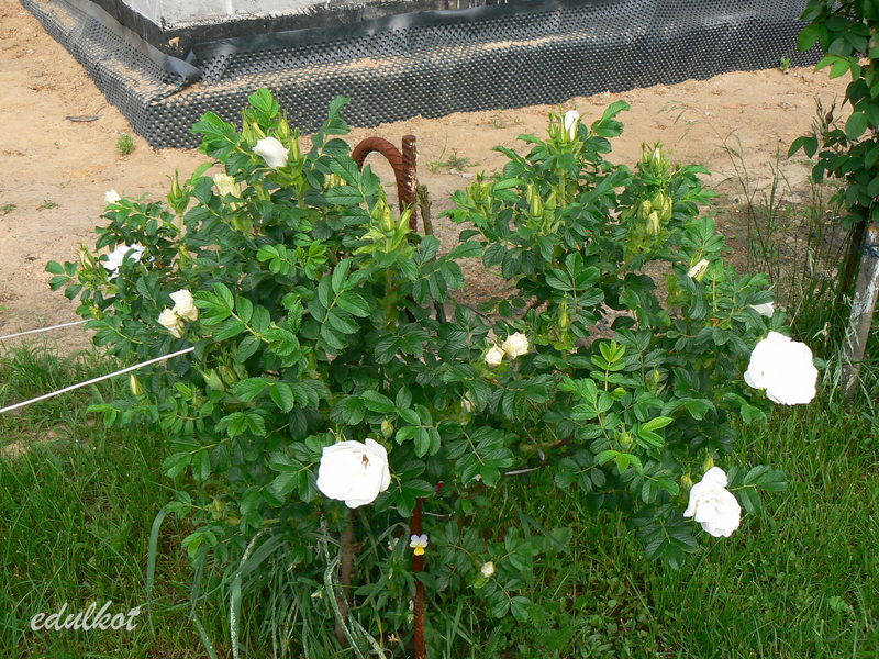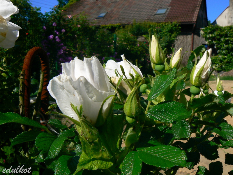 Do tych plusów muszę dodać jeden, ale wielki minus, wystarczy trochę deszczu, a pączki robią się brązowawe, do tego nie czyści się i jej uschnięte rude płatki wiszą potem na końcach pędów, trzeba je usuwać ręcznie, a nie jest to takie proste przy jej wielkości i obecności kolców wszędzie.
