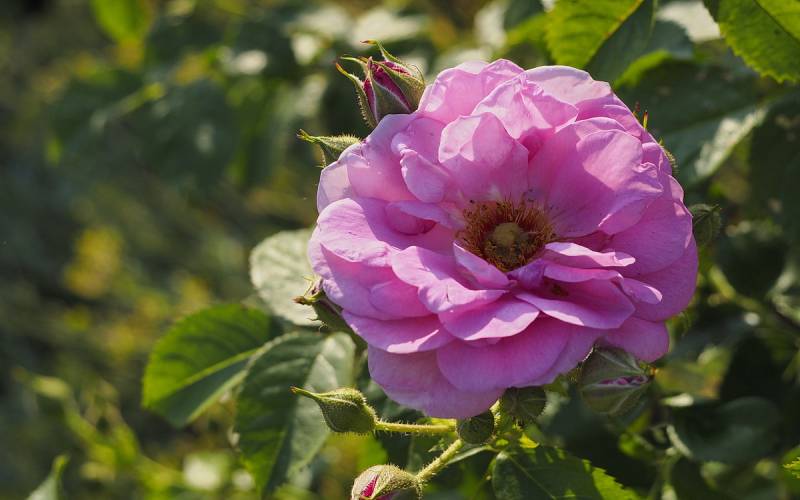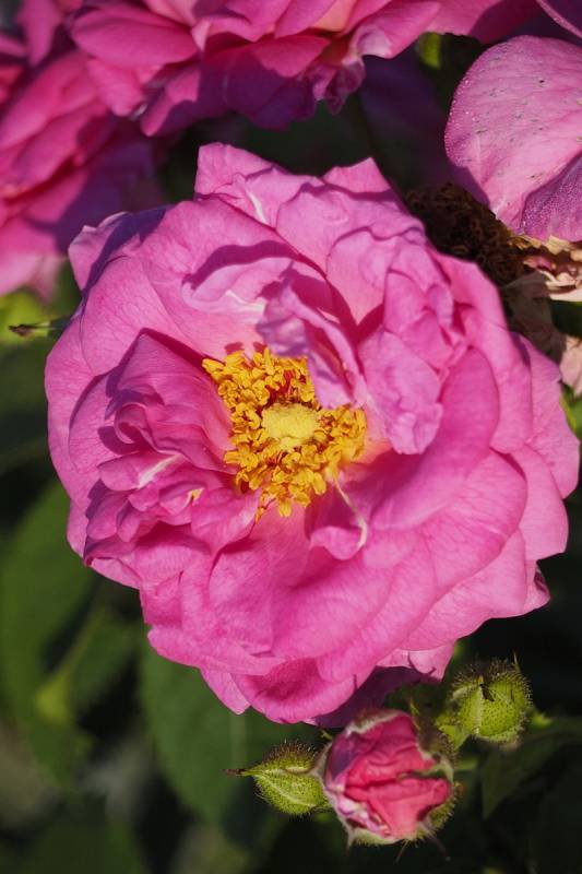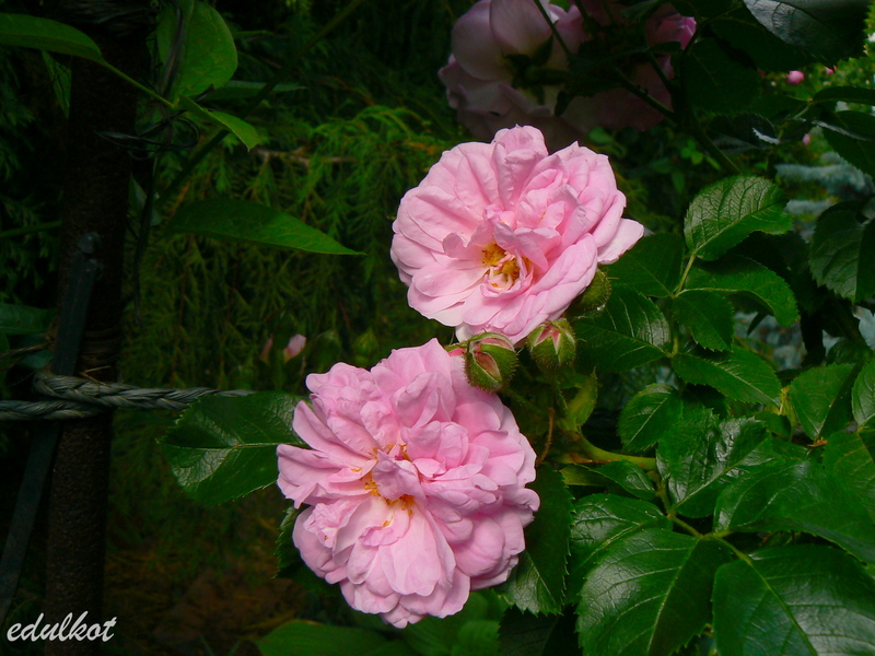 Kwiaty: różowe ok. 8cm, półpełne (25-40 płatków), płaskie, rozetowe,po rozwinięciu się odsłaniają żółte pręciki, kwitnie w klastrach cały sezon.