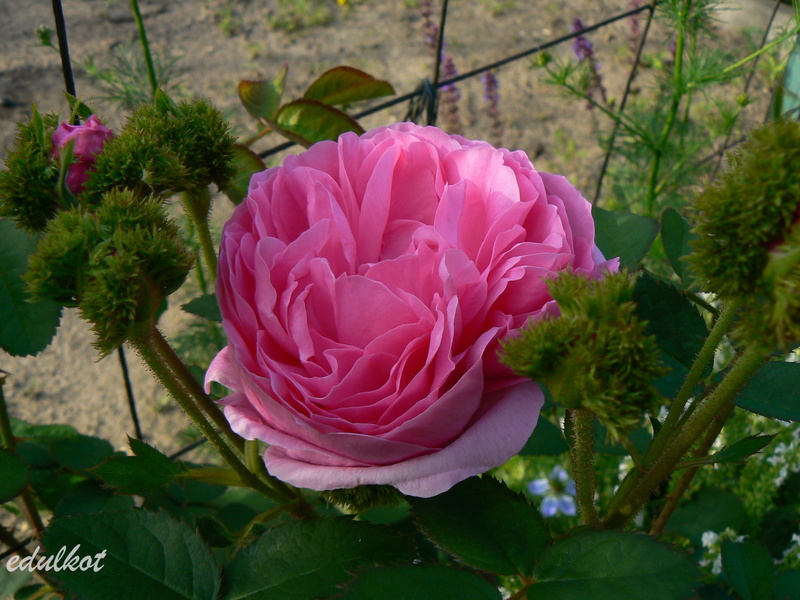 Kwiaty: różowe, pełne (26-40 płatków), charakterystyczne pączki w wyglądzie przypominające kapelusz Napoleona, stąd nazwa Châpeau de Napoléon, kwitnie tylko raz ale długo,