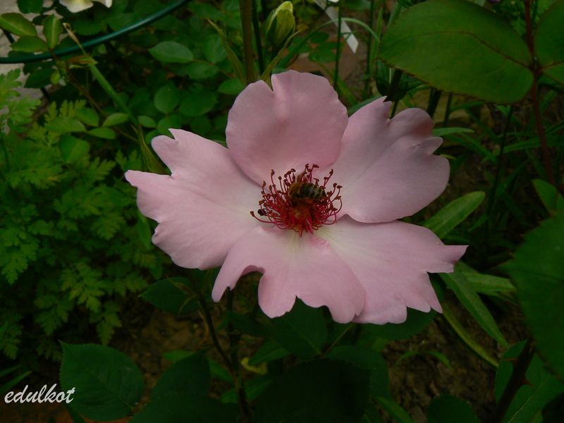 Kwiaty: różowołososiowe, średnie, ok. 9 cm, pojedyncze (4-8 płatków), płaskie, odsłaniają pylniki w rdzawoczerwonym kolorze, powtarza kwitnienie,