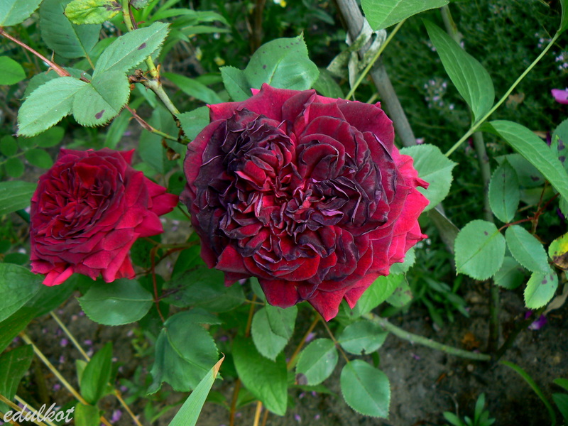 Kwiaty: ciemnoczerwone do purpurowych, ćwierć-rozetowe, duże średnicy 10 cm, pełne (ok. 50 płatkó), słabo powtarza,