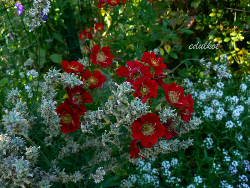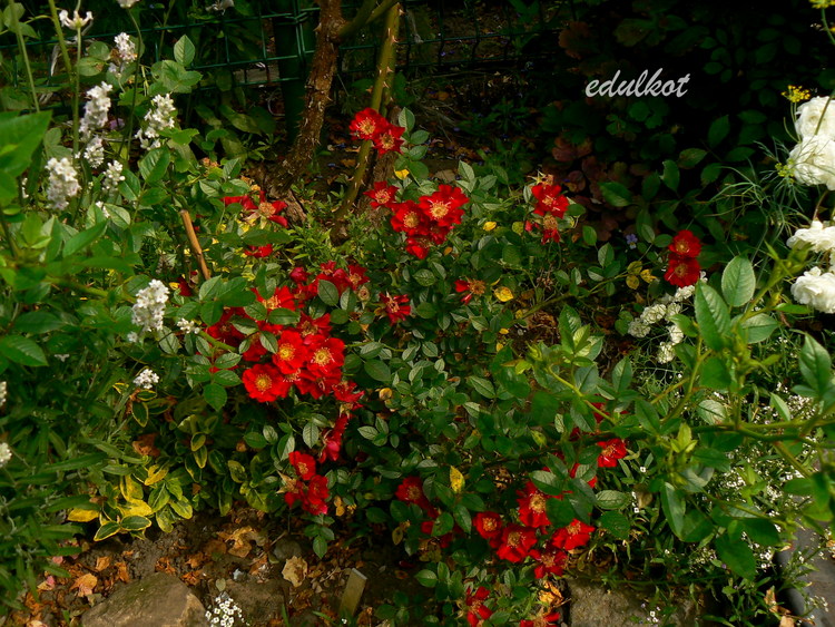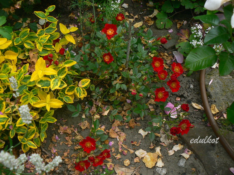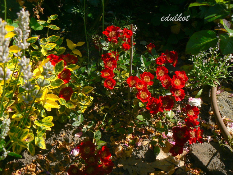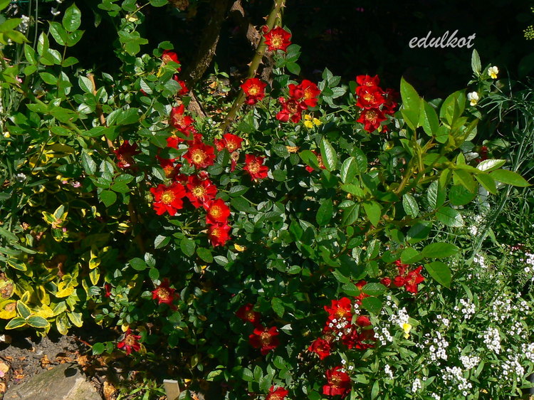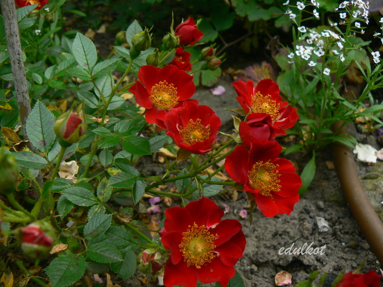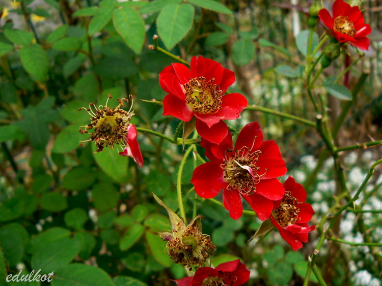 Kwiaty: czerwone z żółtymi pręcikami, małe srednicy 4 cm, pojedyncze (4-8 płatków), zebrane w małych klastrach, obficie kwitnie w lecie, sporadycznie ukazują się kwiatki jesienią,
