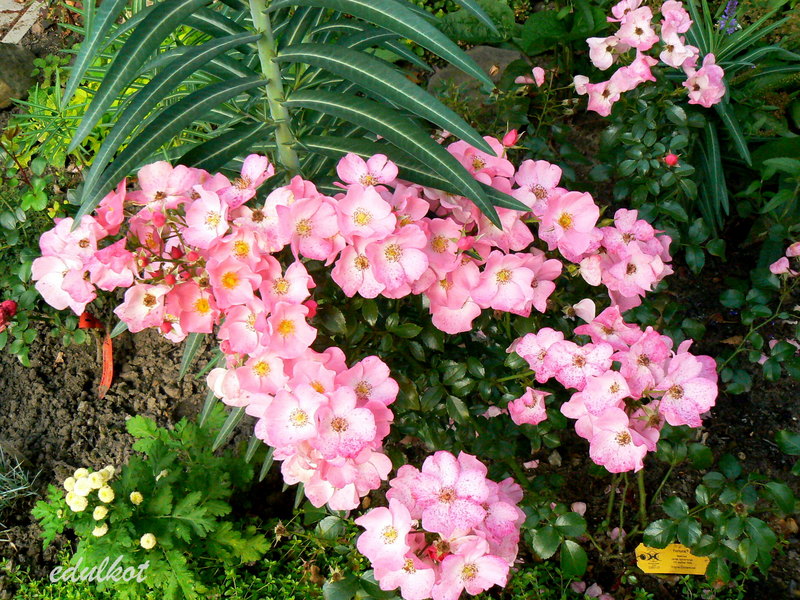 Kwiaty: małe średnica ok. 3-4 cm, pojedyncze (4-8 płatków), łososiowo-różowe z jaśniejszym centrum, kwitnie dużymi bukietami cały sezon,
