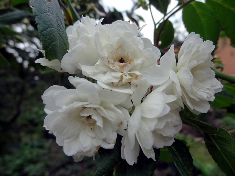 Kwiaty kremowobiałe, półpełne, drobne [około 3 cm średnicy].