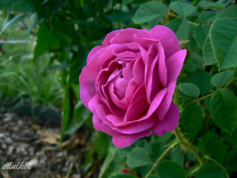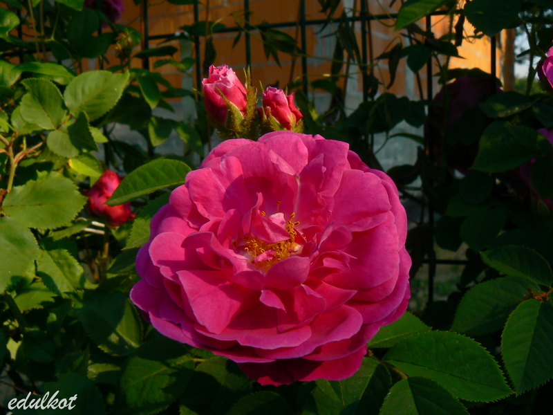 Kwiaty: średnie ok. 6-7,5 cm, półpełne, ciemno różowe poprzez liliowe do czerwonych, w rozkwicie pokazuje żółte pręciki, pąki okryte zielonym mchem, kwitnie raz choć podobno czasami powtarza, zawiązuje owoce,