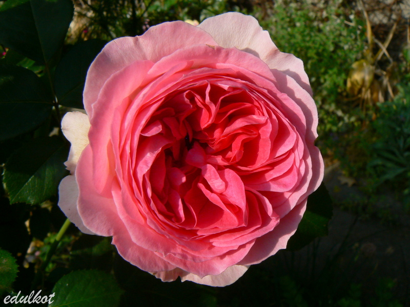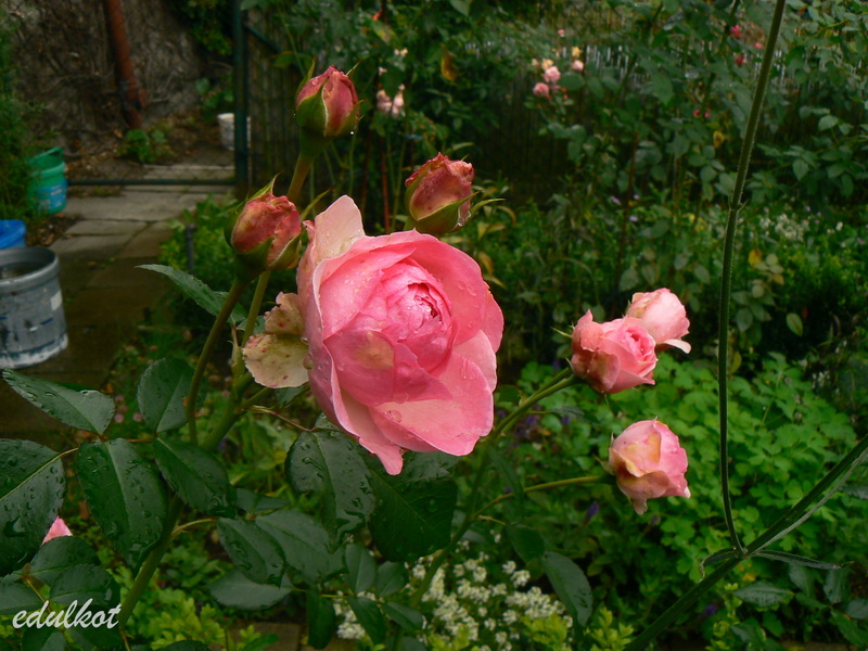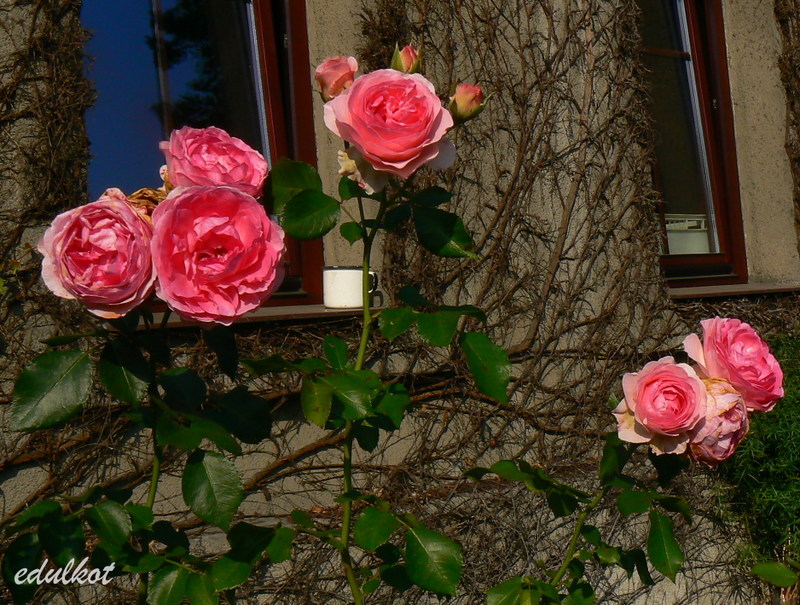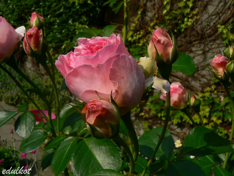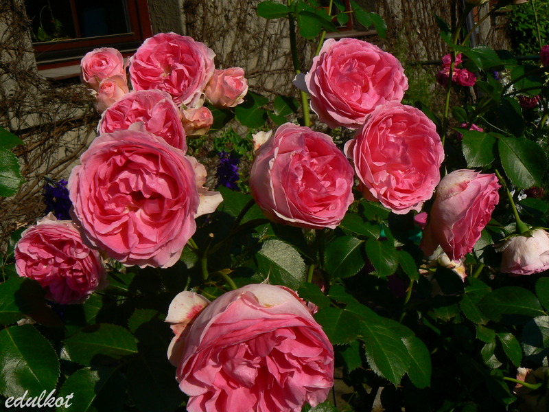 Kwiaty: różowe do jasnoróżowych, średnie, pełne (ponad 40 płatków), kwitnie bukietami cały sezon,