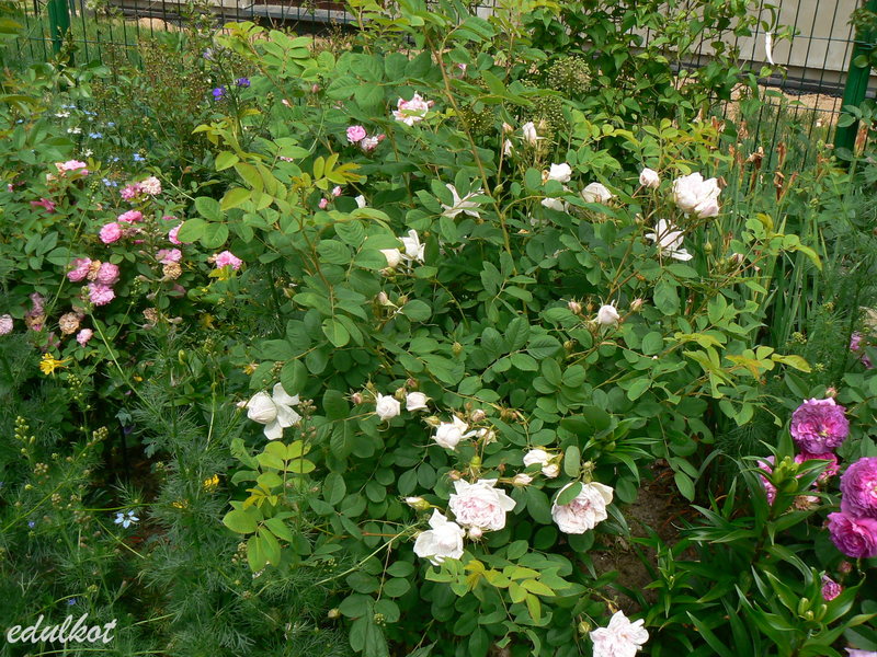 Róża Alba, Centifolia, Turbinata, Pochodzenie: Jean-Pierre Vibert 1819 (Francja) Kwiaty: jasno-różowe, z eleganckich pąków rozwijają się niezbyt eleganckie małe i średnie ok. 5cm, pełne (26-40 płatków), kwitnie raz, Zapach: silny, Wysokość 1,5 m Mrozoodporność: strefa 3b