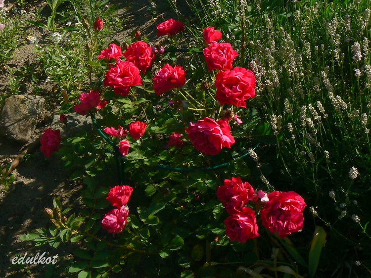 Kwiaty: karminowo-różowe, średnie ok. 6-7 cm, pojedyncze i półpełne (16-25 płatków), kwitnie bukiecikami całe lato, sporadycznie powtarza,