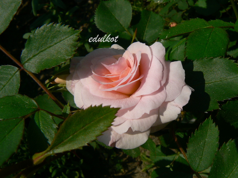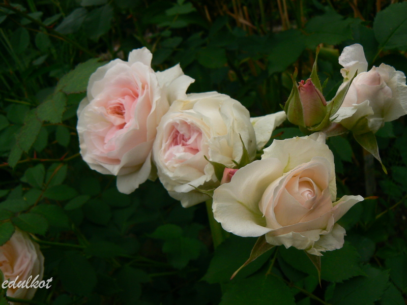 Kwiaty: blado różowe z ciemniejszym perłowo różowym centrum i kremowo białymi krawędziami, bardziej różowe przy zimnej pogodzie, w pełnym rozkwicie jasno różowe, średnie ok. 5-6 cm, pełne (40 płatków), długo utrzymują się na krzewie, kwitnie bukiecikami cały sezon, podobno ma tendencję do zmienności kolorystycznej zależnej od warunków środowiskowych,