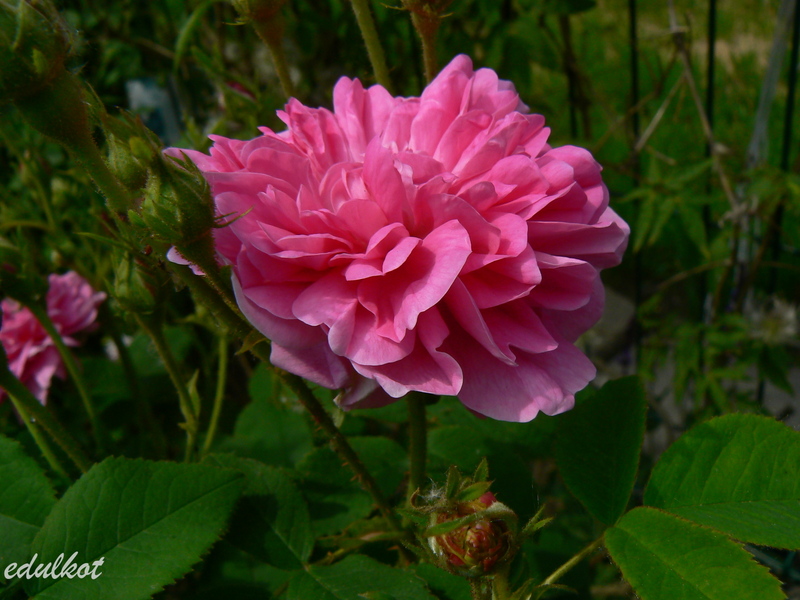Kwiaty: pełne, rozetowe, średnie 8 cm, różowe, w pełnym rozkwicie widać żółty środek, kwitnie raz;