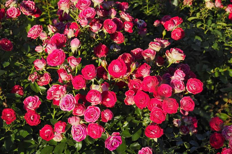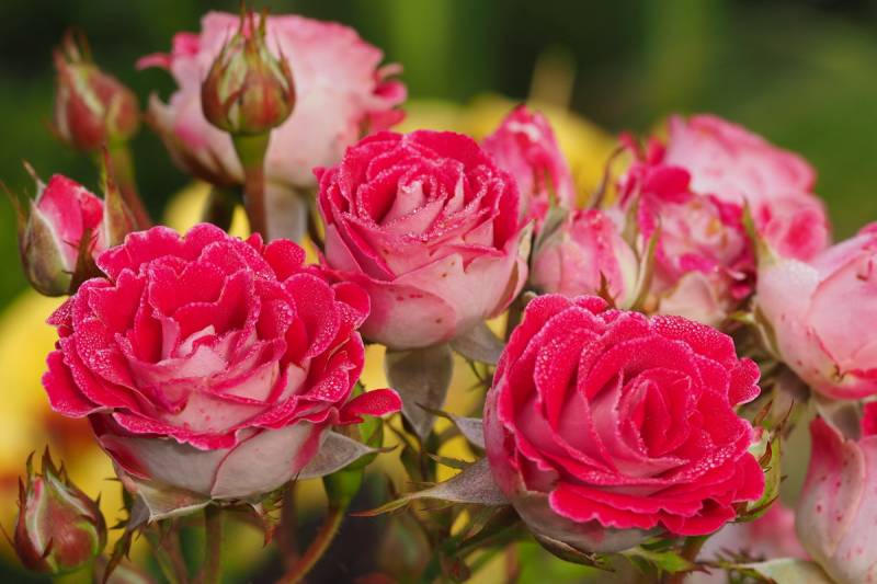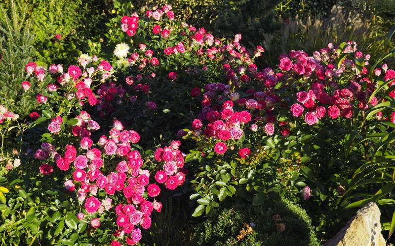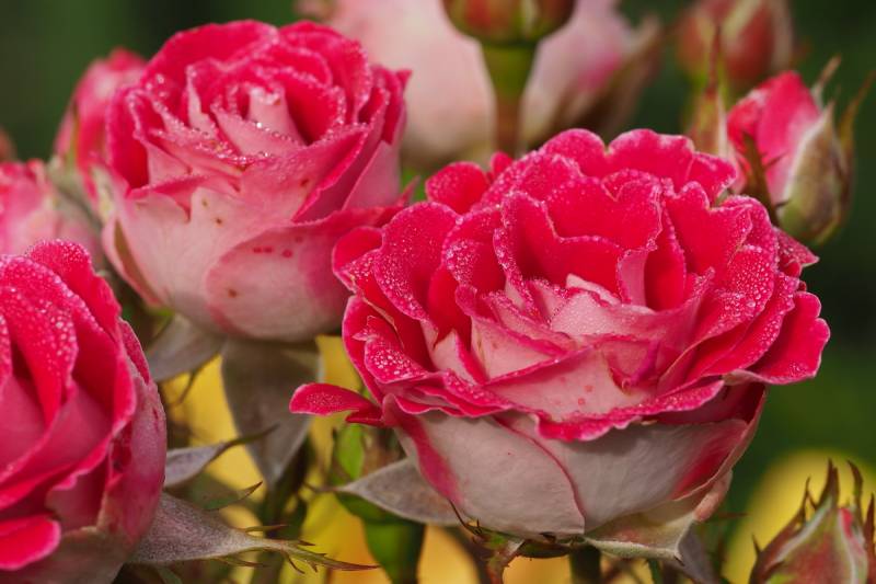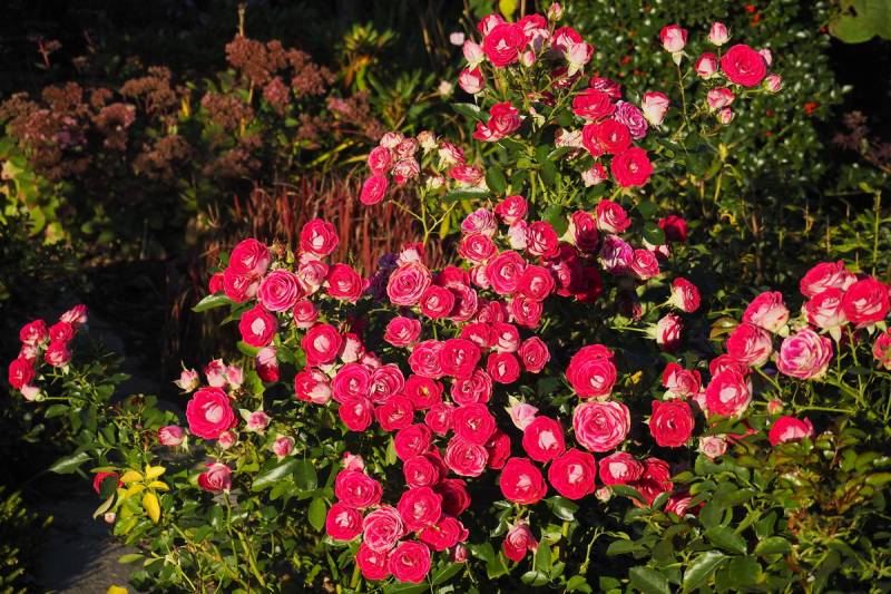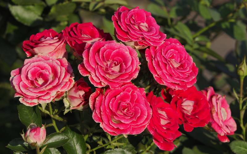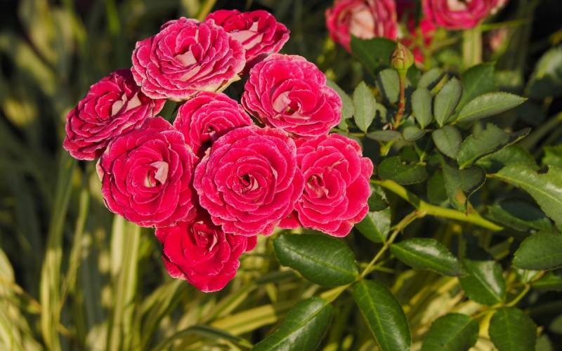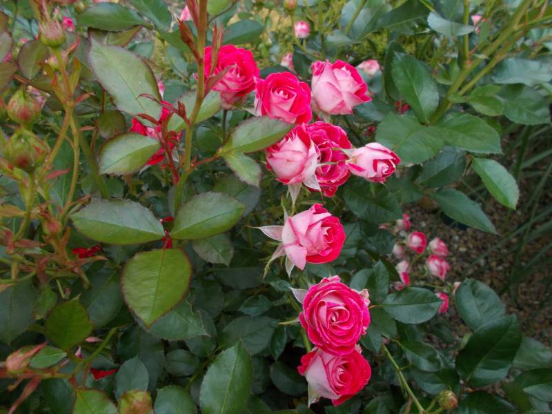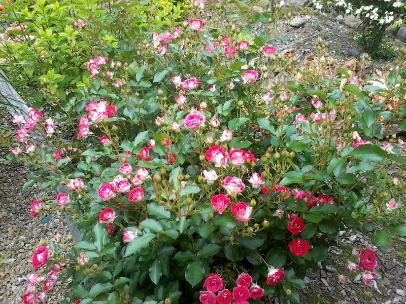 Kwiaty: Drobne średnicy 4-5 cm, pełne czerwono-białe zebrane po kilkanaście w kwiatostanie.