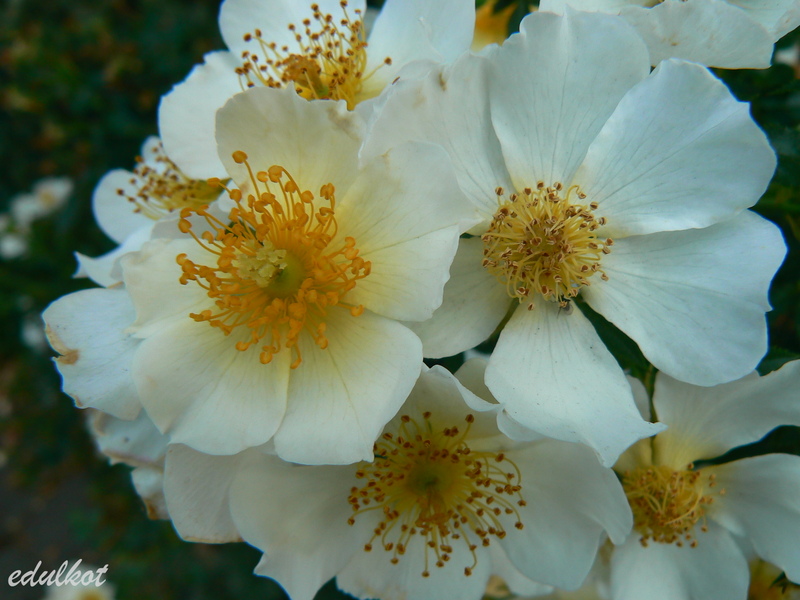 Kwiaty: małe 3 cm, pięciopłatkowe, białe, żółte pręciki, kwitnie bukiecikami cały sezon;
