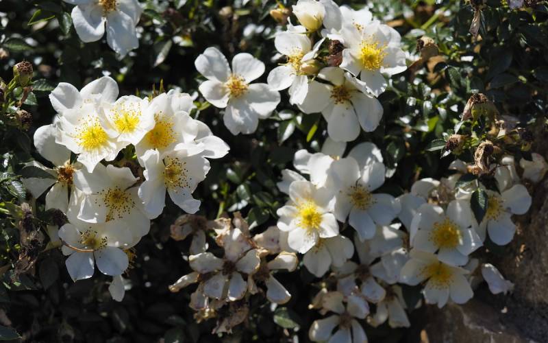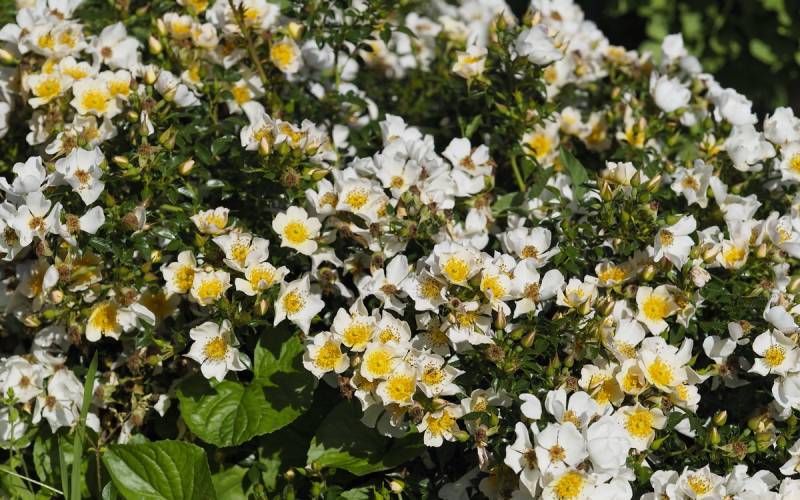 Kwiaty: małe 3 cm, pięciopłatkowe, białe, żółte pręciki, kwitnie bukiecikami cały sezon;