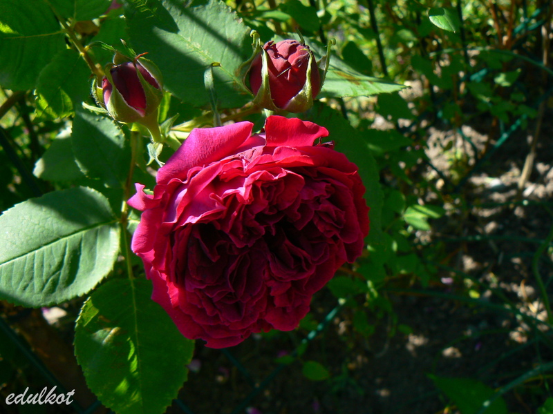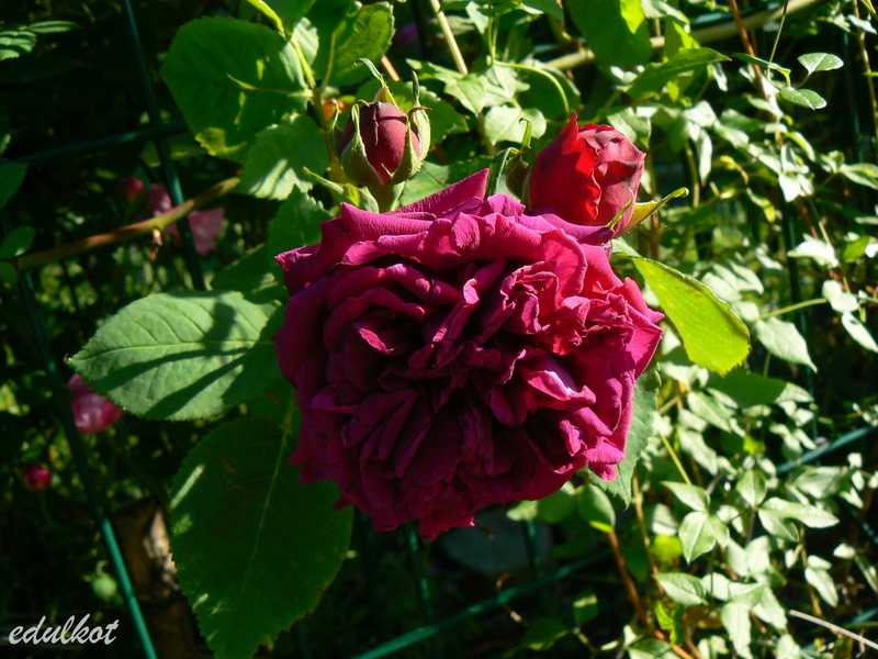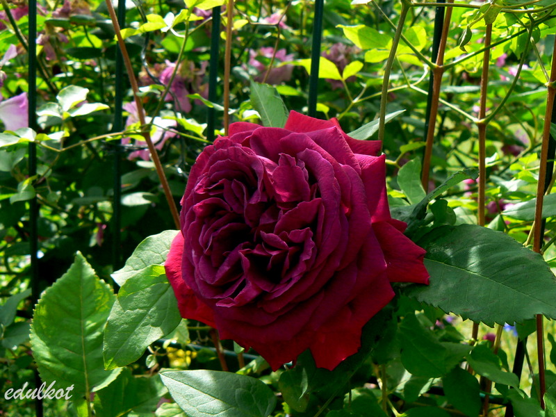 Kwiaty: duże 8-9 cm, bardzo pełne (ponad 40 płatków), aksamitno-czerwony częściowo brązowawy do fioletowego pod koniec kwitnienia, w słońcu przypalają się, pędy prawie bezkolcowe;
