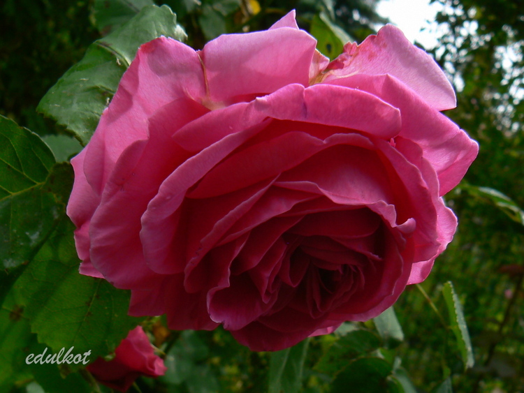 Kwiaty: duże, pełne, ćwierć-rozetowe, czerwono-różowe, purpurowe cieniowania, powtarza kwitnienie;