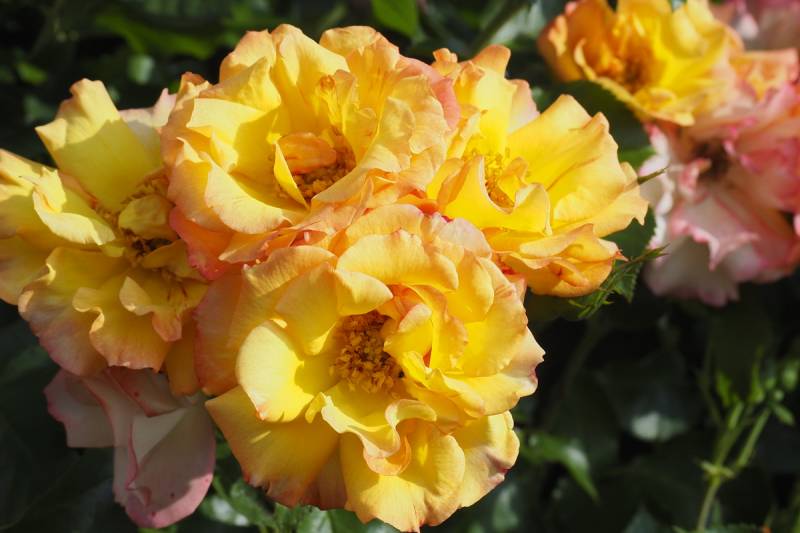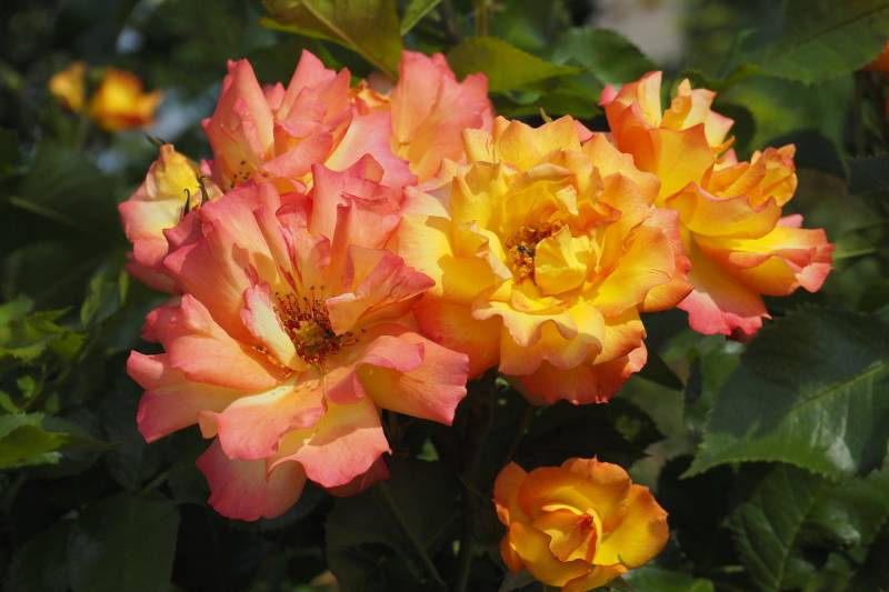 młode kwiaty jaskrawe, żółto-oranżowe, starsze kremowo-czerwone bardziej stonowane; pędy mocno kolczaste.