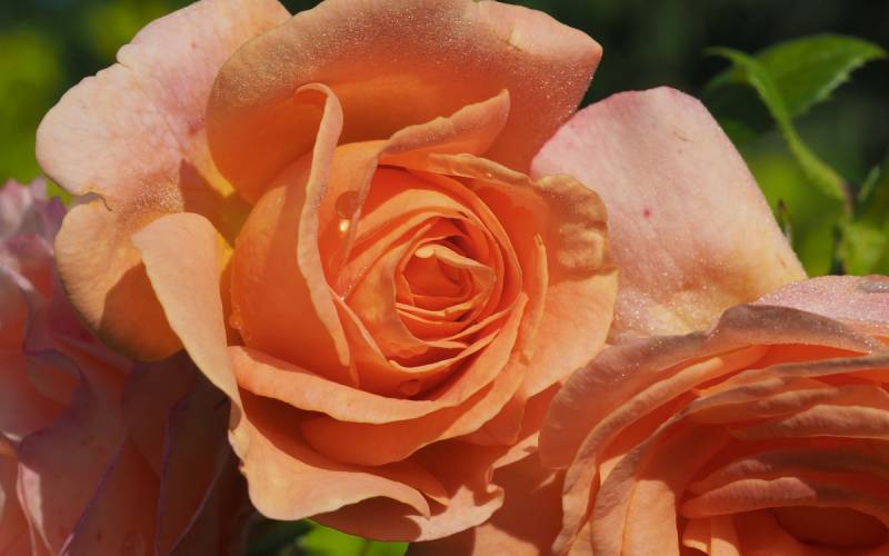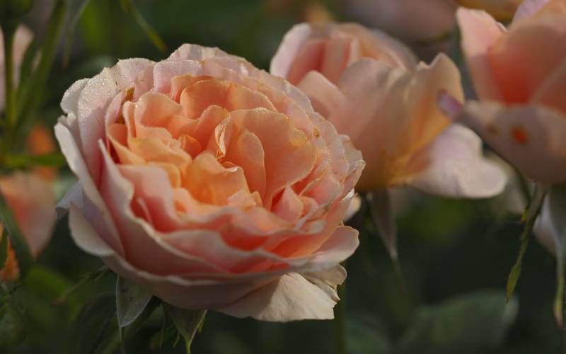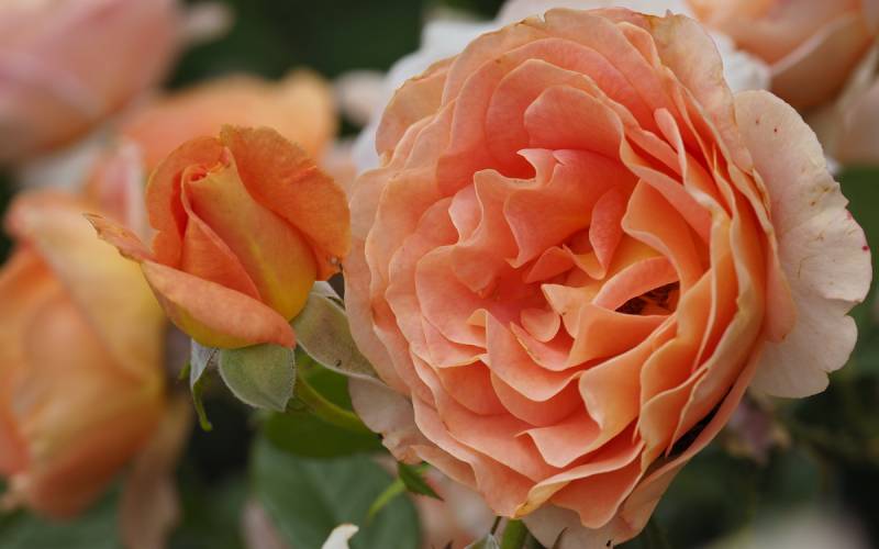 Kwiaty: miedziano-brzoskwiniowe, wpadające w pomarańczowy, a nawet różowy; mocno wypełnione ( Ø: 8 cm ),