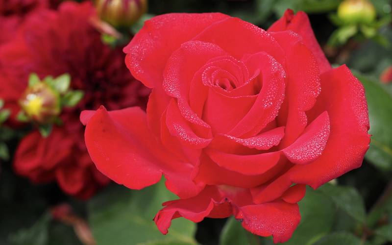 Kwiaty: jasnoczerwone, aksamitne, pięknie ukształtowane, zbudowane z 25-40 płatków ( Ø: 10 cm), kolor trwały, odporne zarówno na deszcz jak i na upały