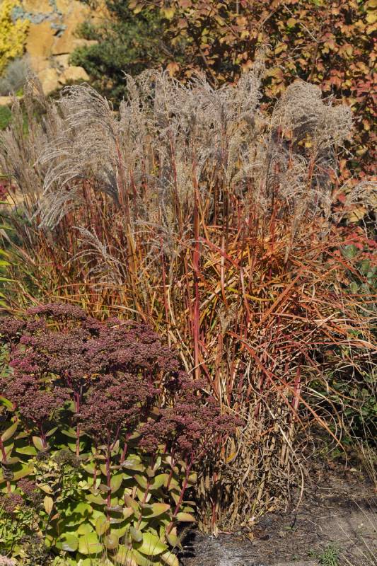 drugi z kwitnieniem zameldował się miskant Roter Pfeil - rośnie u podnóża skalniaka