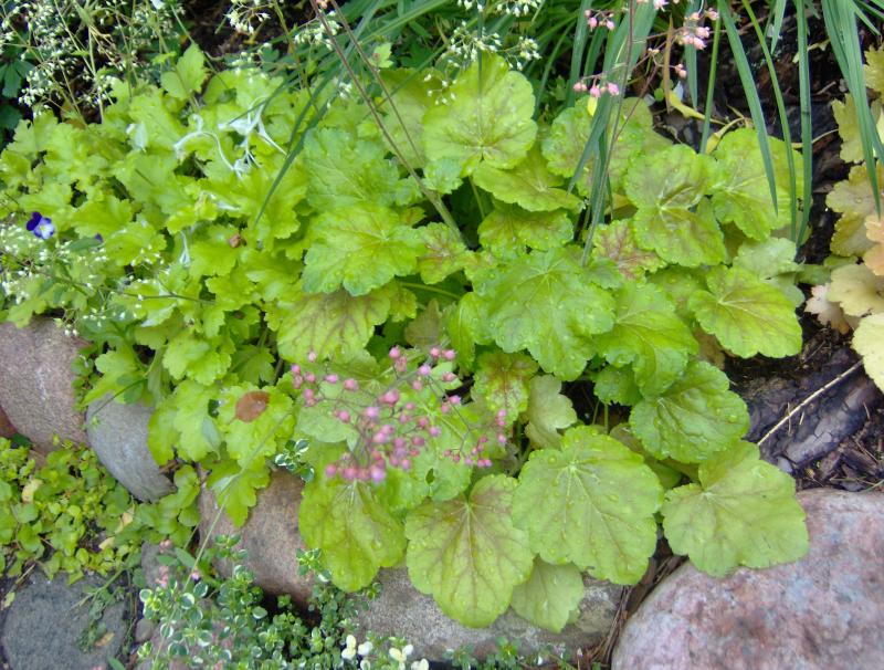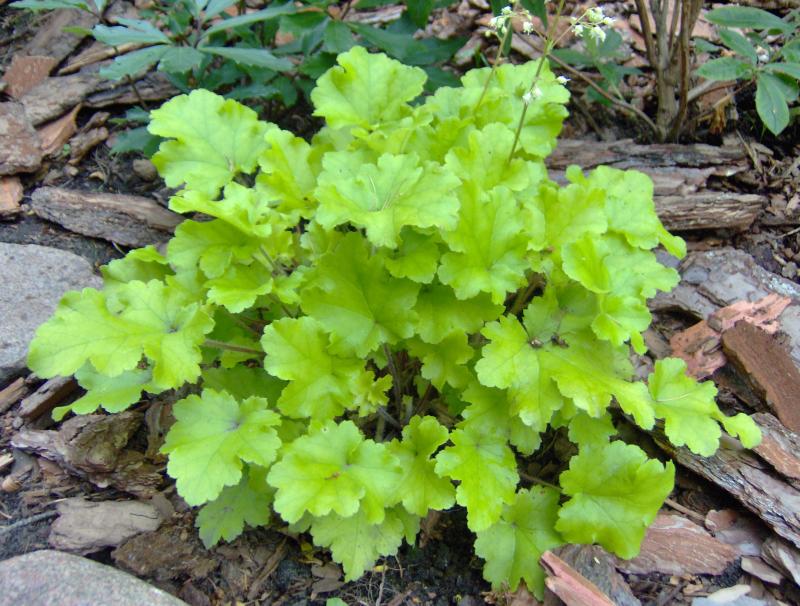 Rodzaj: Żurawka (Heuchera) Odmiana: Lime Marmalade Wymiary : odmiana tworząca kępy o szerokości 45 cm i wysokości 30 cm. Kolorystyka: liście limonkowe, lekko pofalowane. Kwiaty: białe. Kwitnienie: od maja do czerwca. Warunki: stanowisko pół-cieniste/słoneczne