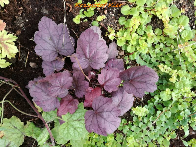 Rodzaj:Żurawka (Heuchera) Odmiana:'Grape Soda' Wymiary : odmiana tworząca kępy o szerokości 40 cm i wysokości 25 cm. Kolorystyka:kremowe kwiaty, różowofioletowe liście . Warunki: stanowisko pół-cieniste/cieniste , gleba żyzna, stale wilgotna. Kwitnienie: od kwietnia do sierpnia.