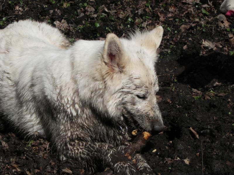 Przy takich panierkach przede wszystkim przydają się szampony tzw. "dirty dog", to są szampony bardzo mocno i dogłębnie myjące, usuwające cały brud, ale także całą warstwę tłuszczową, Po myciu takim szamponem robi się drugie mycie szamponem dopasowanym do szaty. Przy białych owczarkach najczęściej używa się szamponów wybielających, mają one najczęściej kolor granatowy, ciemnofioletowy lub butelkowozielony. Są to bardzo silnie skoncentrowane szampony, które MUSZĄ być rozcieńczane przed użyciem (nawet 1:20). Użycie skoncentrowanego szamponu kończy się niebieskimi albo zielonymi plamami na sierści, oczywiście nie takimi bardzo kolorowymi, ale widać że pies jest w plamy (nie wspomnę o uszkodzeniach włosa). Po takim myciu na włos nakłada się odżywkę dopasowaną do rodzaju szaty, przy szwajcarach to często odżywki do szaty podwójnej. Na szczęście szwajcary, pomimo białego koloru, nie są tak wymagające "picowania" jak inne rasy. Moje "matołki" też są nieczęsto kąpane, teraz mniej jeździmy na wystawy, to i takiego musu nie ma. A że jest to dla mnie coraz bardziej uciążliwe to i częstotliwość mniejsza. Mam niestety wannę i wsadzenie do niej takiego np.Maćka, który waży prawie 50 kg, a potem kilkukrotne namoczenie tej góry futra kończy sie takim bólem mojego kręgosłupa, że - same rozumiecie - nie śpieszę się do tego