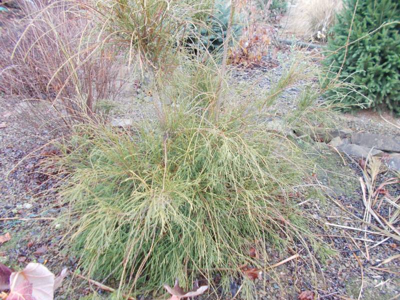 Łuskowate, zimozielone igły, na końcach zaostrzone, odstające, rozmieszczone rzadko, długości 3-4 mm, na gałązkach silnie przylegające, długości około 2,5 mm. Łuski rosnące na dolnej i górnej płaszczyźnie gałązki opatrzone wypukłym gruczołkiem żywicznym, boczne krótsze i bez gruczołków.