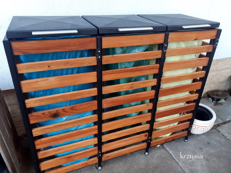 Nie altana, nie wiata, nie pergola, ani nie trejaż, ale w podobnym stylu , tuż przed nadejściem zimy, syn ukończył ( zaczęty ze 2 lata temu ) stojak na worki do segregacji. Tymczasowo ustawił go pod domem, co przy tegorocznej zimie okazało się bardzo praktyczne, wiosną zostanie przeniesiony za winogrona, pod budynek gospodarczy.