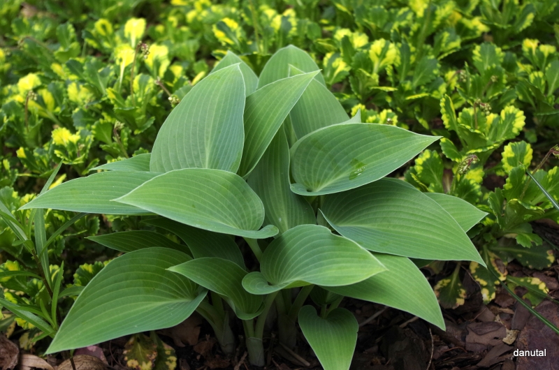 Rozmiar: M wysokość 35-40cm Liście: sztywne,sercowate niebiesko-zielone, na bardziej nasłonecznionych stanowiskach zmieniają się na żółtawo-białe Kwiaty: lawendowe Zalecane stanowisko: półcień/cień Uwagi:
