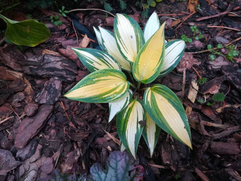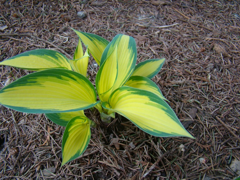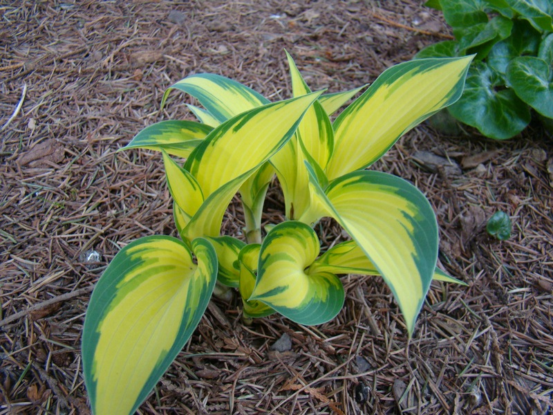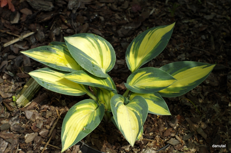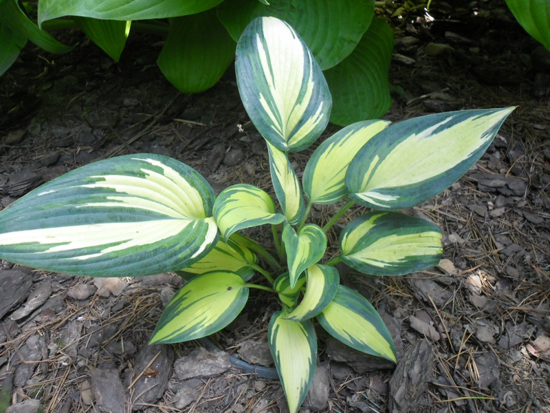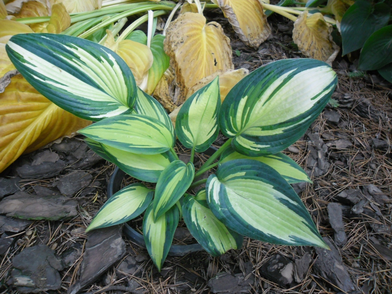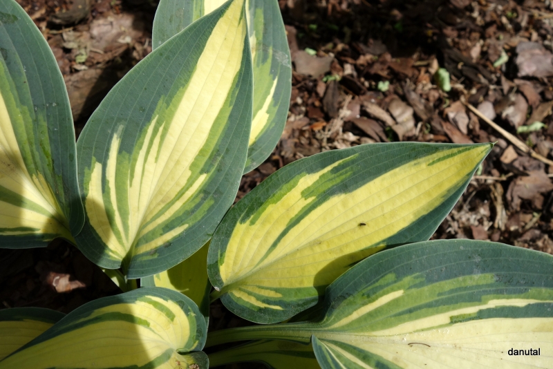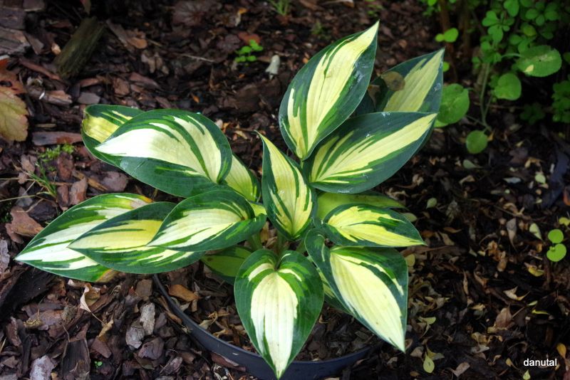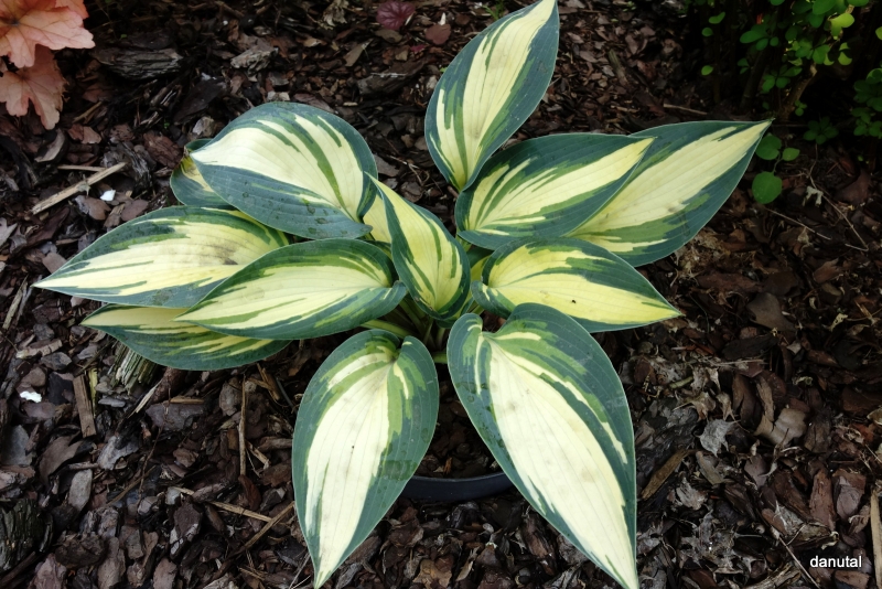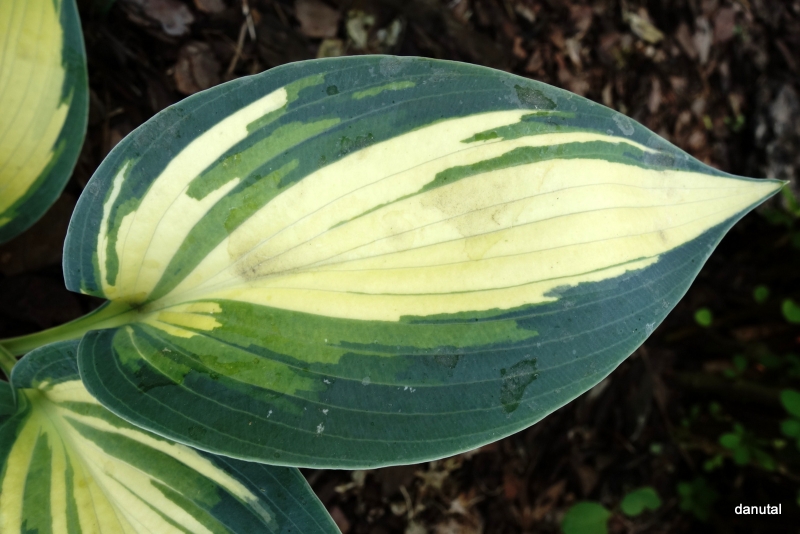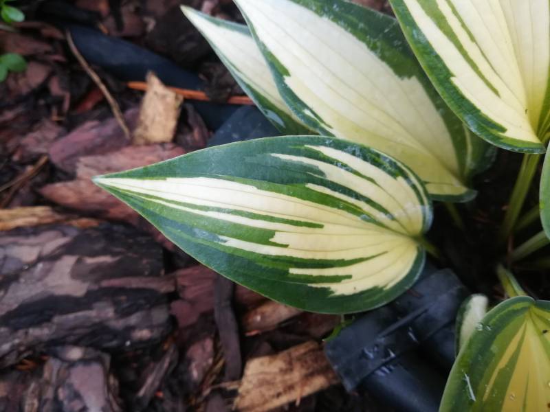 Liście: sztywne,w kształcie serca; kremowo-białe z niebiesko-zielonym marginesem