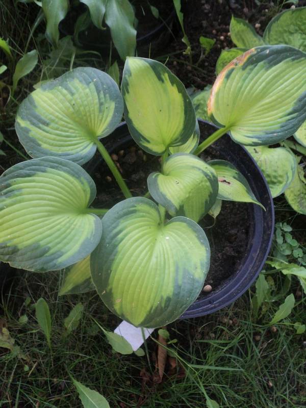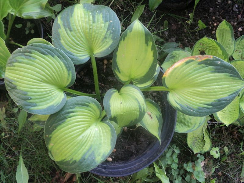 Rozmiar: M wysokość 40-45cm Liście: owalne,grube, w kształcie serca niebiesko-zielone z żółtym centrum Kwiaty: blado lawendowe Zalecane stanowisko: półcień/cień